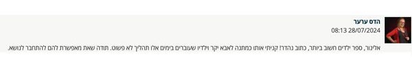 ״תודה אלינור על הספר שקניתי לאחיינית שלי. הקריאה בו עוררה שיח והצפת רגשות שמאוד חשוב לדבר עליהם עם ילדים להורים גרושים (ותודה על ההסבר לגבי החשיבות בשימוש במילה עצמה).״